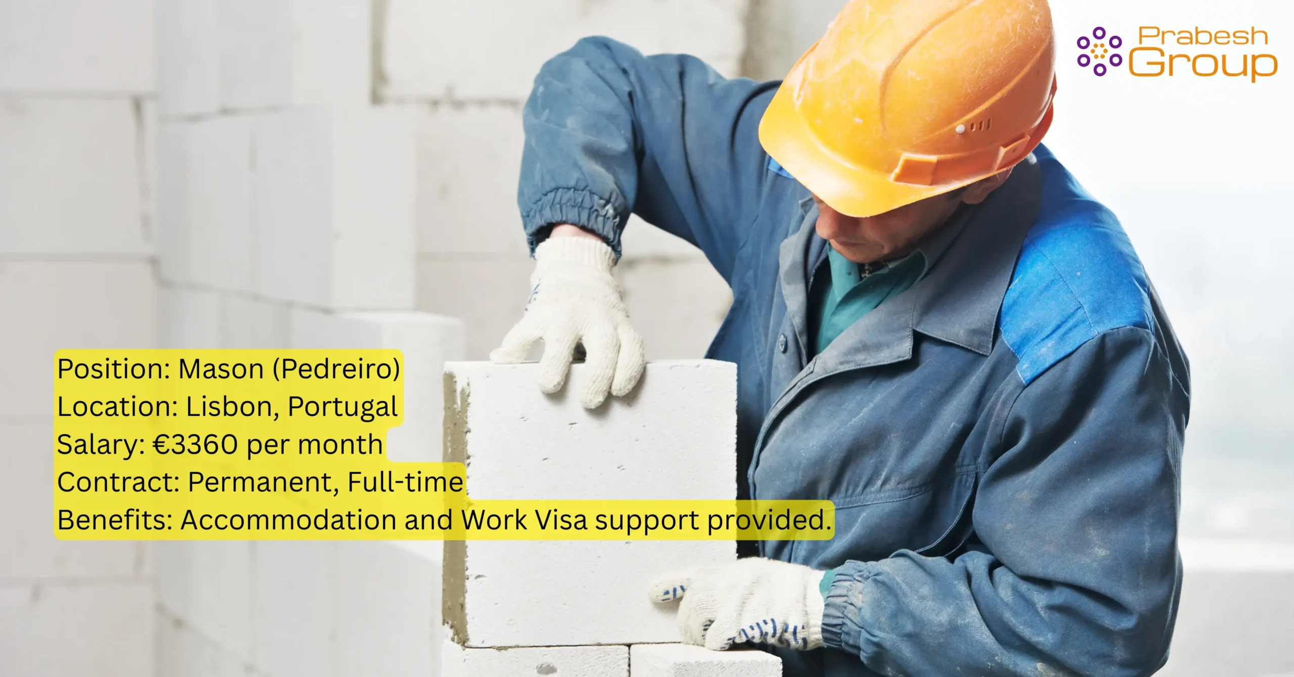Prabesh Group is seeking an experienced and skilled Mason (Pedreiro) for a permanent, full-time construction project in Lisbon, Portugal. This is an excellent opportunity to secure a stable career with a competitive salary and comprehensive support in a major European capital.